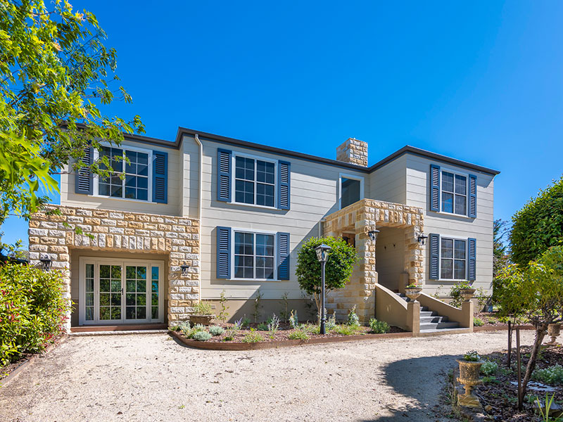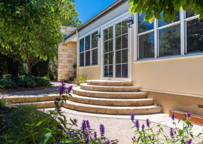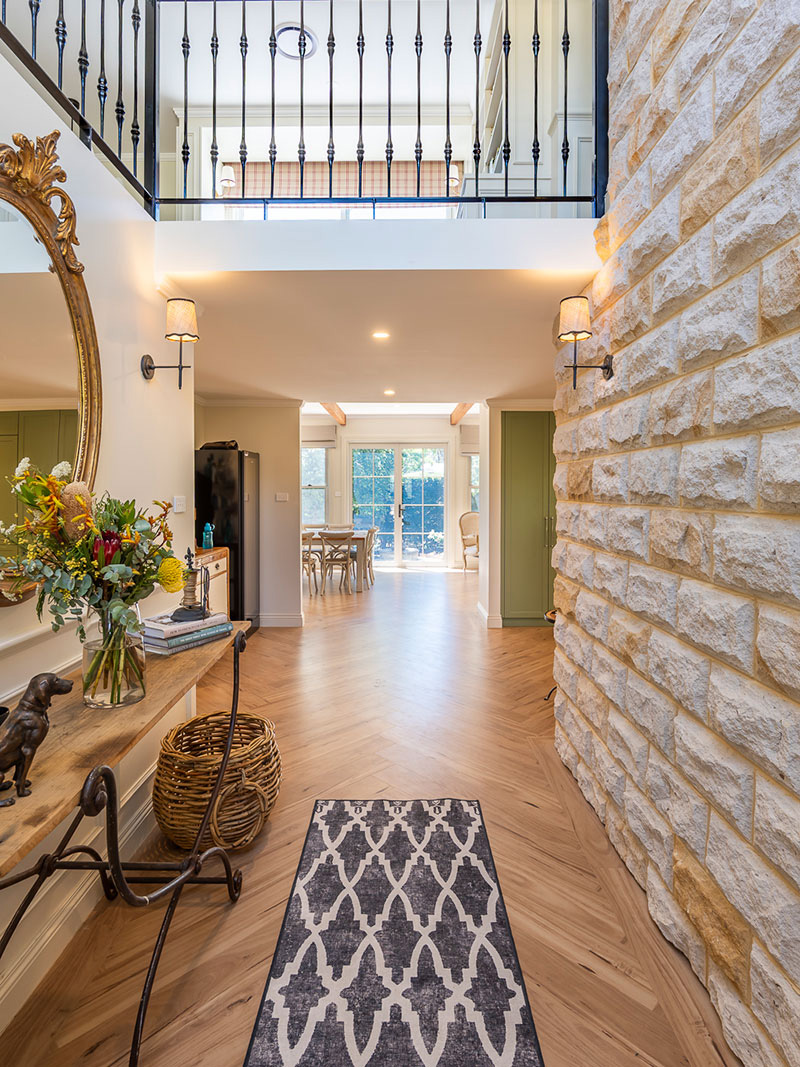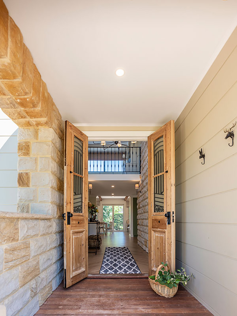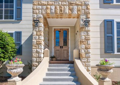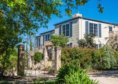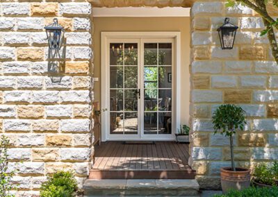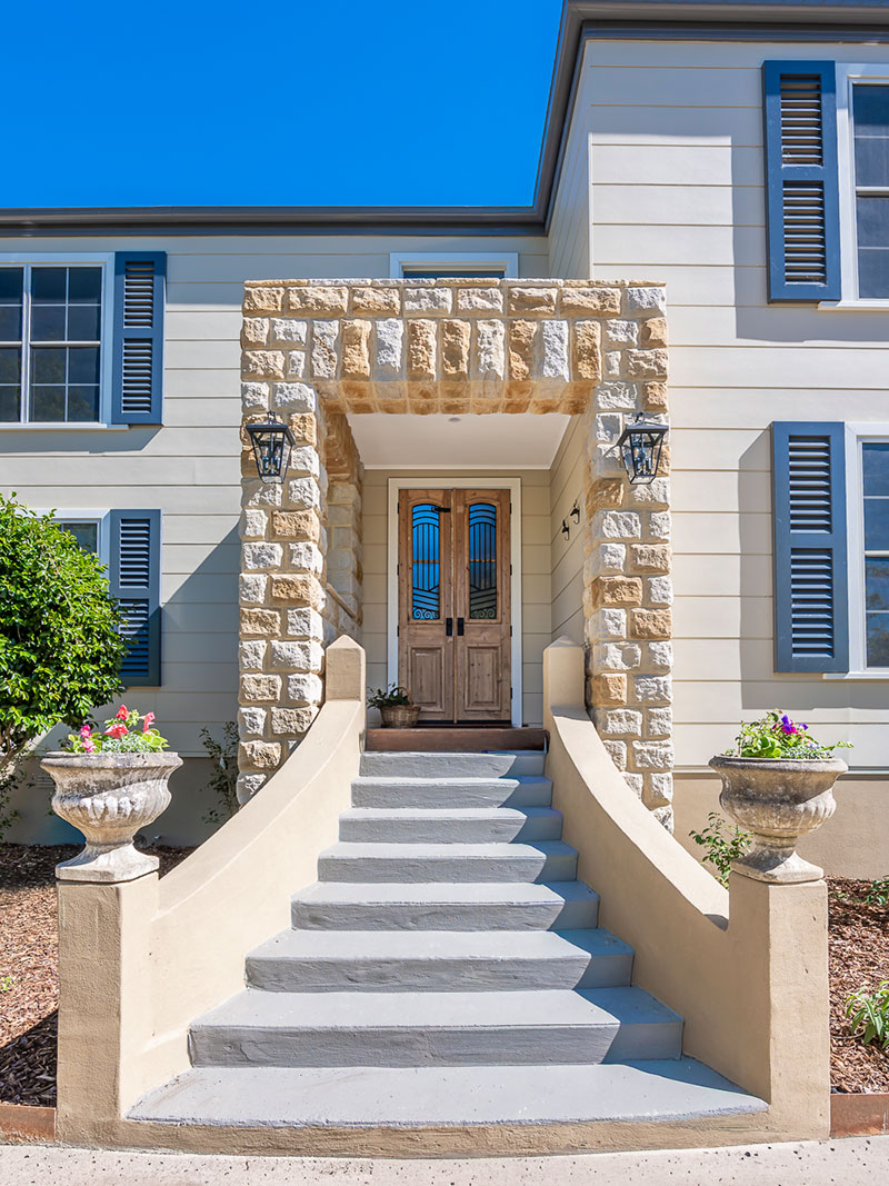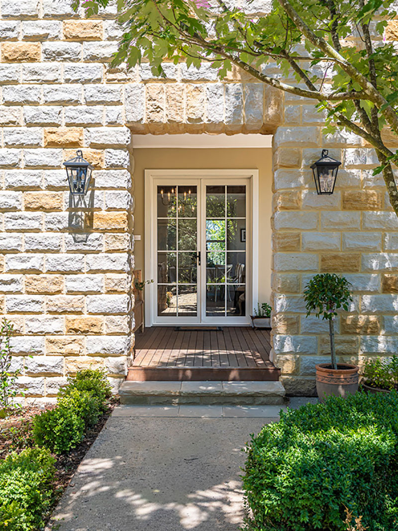 The Exterior – The French-Country classic proportions and traditional detailing were retained by the use of locally quarried sandstone, preloved vintage French-style front entry doors, shutters and classic French garden layouts.