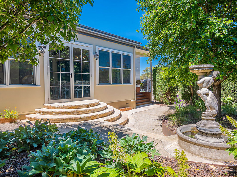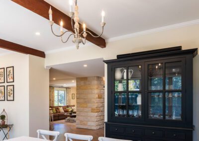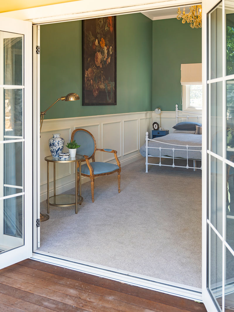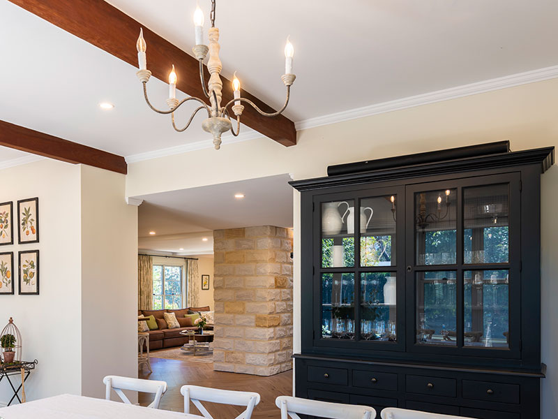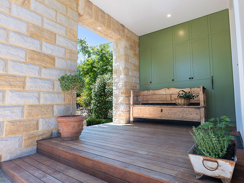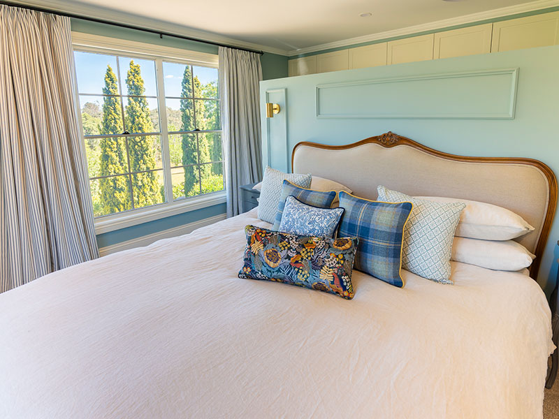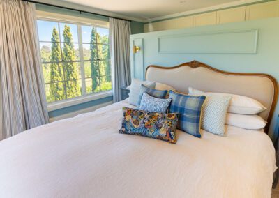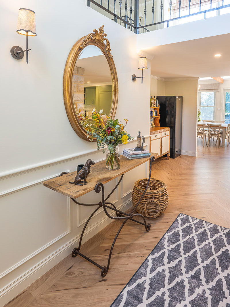 The Interior – The owners wanted to preserve the home’s European character while introducing comfort and durability suited to contemporary use. I for Style’s creation of a layered interior with a French- Country influence included a fluted butlers sink, stunning wainscoting and wall mouldings on the library joinery and the wall behind the main bedroom bed, antique and salvaged pieces throughout. All these elements add depth, warmth and authenticity.